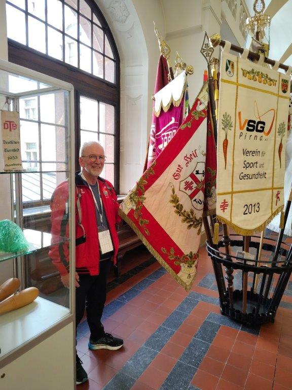 Gregor Weißbrich mit der traditionellen Vereinsfahne im Rathaus