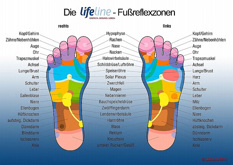 Diese Methode basiert darauf, dass es für jedes Organ, für die Wirbelsäule, die Gelenke, für die Sinnesorgane usw. entsprechende Zonen am Fuß gibt, durch die Einfluss auf das betreffende Körperareal genommen werden kann.